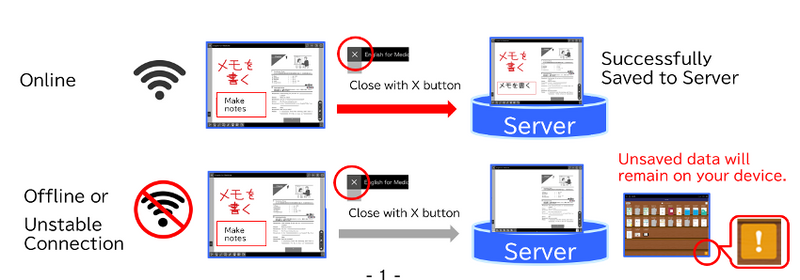 The data may not be saved properly if the network is turned on and off, or the network connection is unstable. If there are unsaved annotations, the “!” mark will appear at the bottom right corner of the bookshelf. Please connect your device to the internet where there is a stable connection and tap the “!” mark to save to the server. Once the “!” mark disappears, it has been successfully saved.